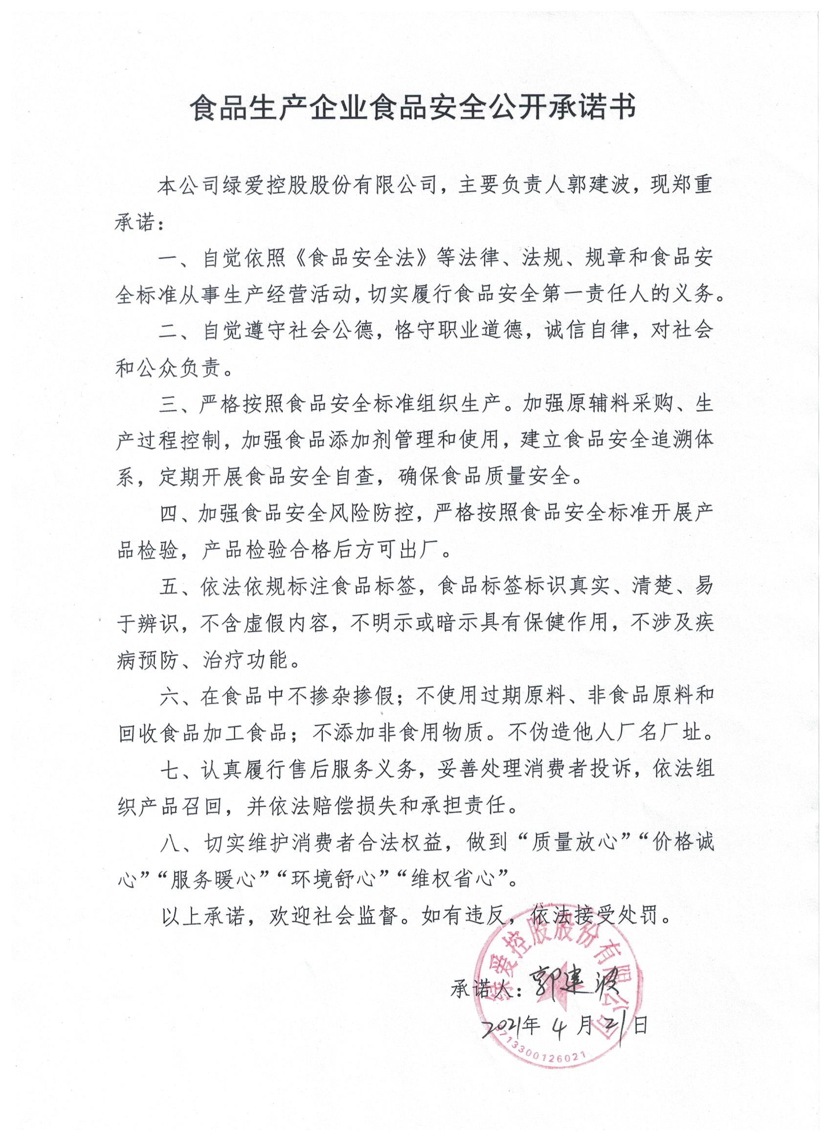 為保證食品安全,保障消費者身體健康和生命安全,遵照《食品安全法》等法律法規(guī)的相關(guān)規(guī)定,我公司作以下承諾: